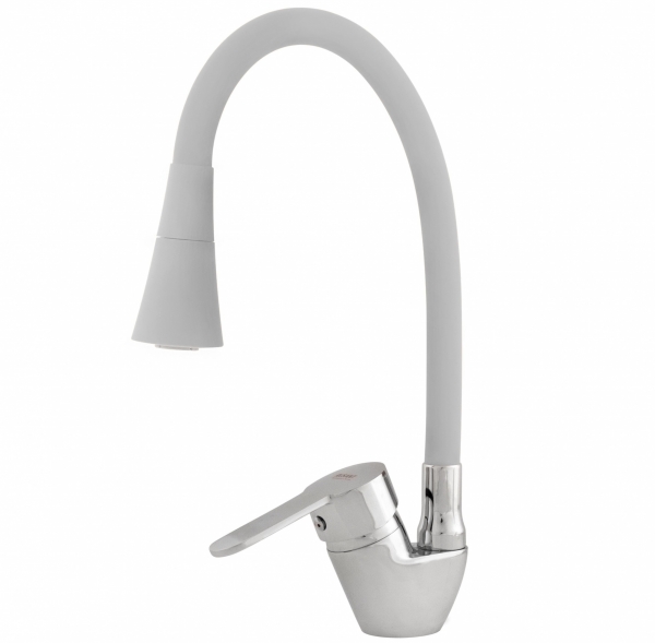 Смеситель для кухни из нержавеющей стали шаровый с высоким выдвижным изливом, аэратор с переключателем: душ-струя. Боковая металлическая ручка. Крепление: гайка. Картридж керамический 40мм. Цвет корпуса и ручки: нерж сталь. Высота смесителя: 41см. Без подводки для воды. |