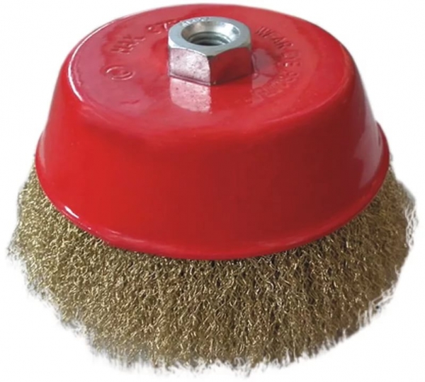 Для изготовления щетки применяется стальная латунированная витая проволока диаметром 0,3 мм. Корпус щетки выполнен в форме чашки методом штамповки из листовой стали. Применяется для щадящей очистки поверхностей и получения заданной шероховатости. |