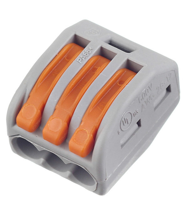 Клемма используется для соединения трех силовых проводов одножильных или многожильных. Обеспечивает быстрый и надежный монтаж без использования пайки или изоленты. Зачищенные от изоляции провода просто вставляются в отверстия и прижимаются с помощью рычагов. Такое соединение позволяет экономить место в распределительной коробке и отличается повышенной безопасностью. |
