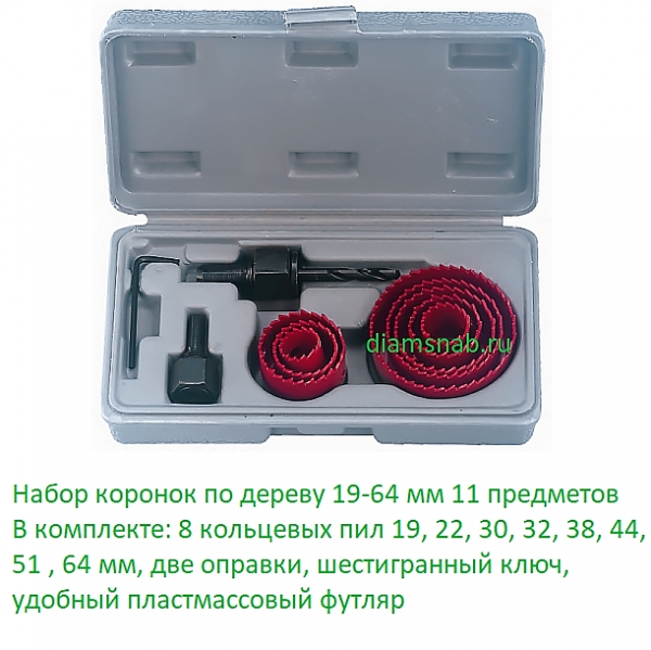 Набор кольцевых пил по дереву 11шт 19-64мм с державкой