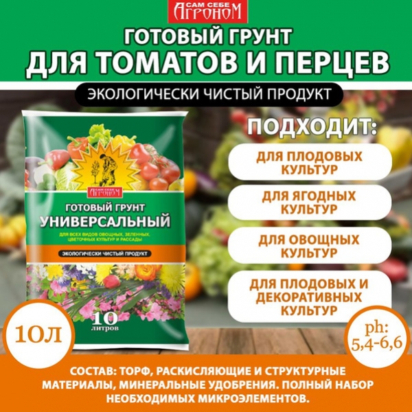Грунт САМ СЕБЕ АГРОНОМ универсальный 10 литров.Используется для проращивания семян всех видов овощных, ягодных, цветочных и декоративных культур на школку, для пикировки и выращивания рассады этих культур в условиях защищённого домашних, тепличных и открытого грунта; для выращивания всех видов плодовых, ягодных, овощных, цветочных и декоративных культур в различных климатических условиях, как в открытом, так и в защищенном грунте. Пригоден для выращивания газонных трав и травяных покрытий стадионов и спортивных площадок. Возможно применение в качестве подкормки и мульчирующего материала. |