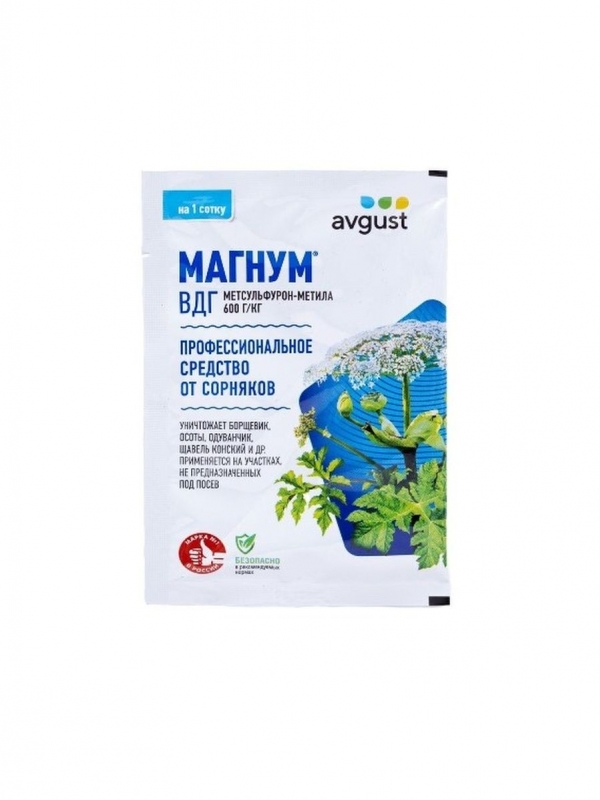 Средство для защиты от сорняков Магнум эффективно борется с одно- и многолетними двудольными сорняками. Одного пакета достаточно для обработки площади до двух соток. Средство концентрированное, перед использованием требуется разбавление. Готовый раствор нужно использовать в течение четырех часов. Способ применения: Опрыскивание по растущим двудольным сорнякам одуванчик, подорожник, амброзия, бодяк полевой, горцы, горчица, звездчатка средняя, крапива, лютик, осот, пастушья сумка, пикульник виды, ромашка, щавель, ширица и др. в фазе 2-4 листьев у однолетних и при высоте многолетних 10-15 см. Добавление препарата Адью в раствор Магнума усиливает действие раствора. Меры безопасности: Обработку проводить в отсутствие детей и животных. Работать в специально предназначенной для этой цели одежде, перчатках и респираторе. Хранить препарат отдельно от лекарств, пищевых продуктов и кормов для животных в сухом, прохладном месте, недоступном для детей и животных. Запрещается: Пить, принимать пищу, курить. Использовать посуду емкости для пищевых продуктов и питьевой воды для приготовления рабочих растворов. |