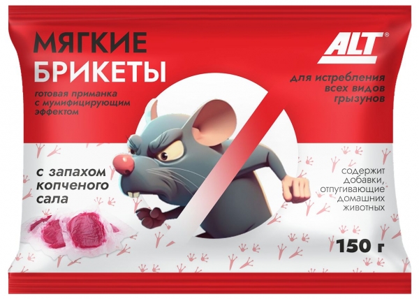 Грызуны – незваные гости в любом доме. Они не только досаждают своим присутствием, но и могут нанести серьезный ущерб, портя продукты питания, мебель и электропроводку. Избавиться от них бывает непросто, но с мумифицирующей приманкой Альт борьба с грызунами станет эффективной и безопасной. Описание Приманка Альт представляет собой мягкие брикеты, изготовленные из высококачественных ингредиентов с добавлением копченого сала. Привлекательный для грызунов запах копчености не оставляет им шансов устоять перед лакомством. Преимущества Эффективность: Приманка Альт обладает мумифицирующим эффектом. Это означает, что после поедания приманки грызун погибает, но его тело мумифицируется, не оставляя запаха разложения. Безопасность: Приманка Альт не содержит ядовитых веществ, поэтому она безопасна для людей и домашних животных. Удобство использования: Приманка готова к применению. Вам нужно только разложить брикеты в местах, где обитают грызуны. Экономичность: Приманка Альт расходуется экономно. 150 г брикетов достаточно для обработки площади до 50 квадратов Назначение Приманка Альт предназначена для уничтожения крыс, мышей и других грызунов в жилых и нежилых помещениях. |