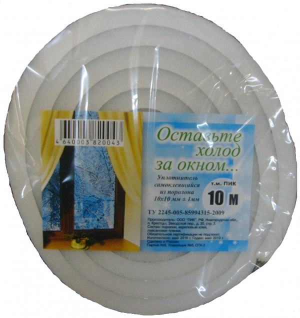 Уплотнитель для окон самоклеящийся 10 х 10 мм, 10 м./20/59 руб.