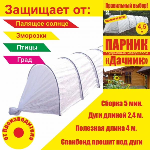 Основой парника Садовод премиум является дышащий нетканый спанбонд белого цвета плотностью 60 гр м. Самый плотный в своей линейке, способен выдерживать кратковременные заморозки до минус 10 градусов. Каркас представляет собой сплошные дуги, изготовленные из прочного термостойкого полипропилена. Длина парника 4,5 и 6,5 метров, диаметр дуги 20 мм. Спанбонд имеет небольшой вес, но при этом хорошо защищает молодые растения от снега, града и сильных ветров. Он имитирует тропический микроклимат, в среднем температура в садовом парнике из агроткани на 10 градусов выше по сравнению с уличной, что способствует прогреванию почвы, увеличению всхожести и получению более раннего урожая. Укрывной материал парника Садовод премиум хорошо пропускает солнечный свет и влагу, предохраняет почву от выветривания и не накапливает конденсат. Парник прост в использовании, в отличии от теплицы его можно переносить в любое место, а благодаря прошитому укрывному материалу парник легко складывается гармошкой и готов к хранению до нового сезона или транспортировке. |
