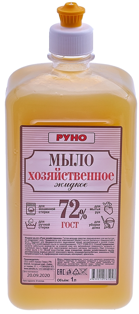 Мыло Хозяйственное жидкое РУНО 72 процента применяется для мытья рук и посуды, стирки белья не раздражая кожу рук, используется для комплексной уборки, эффективно устраняет загрязнения на любых поверхностях. Максимальная универсальность, удобство применения, чистый результат |