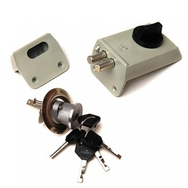 Замок накладной дисковый с вертушкой. Предназначен для установки на деревянные двери. Засов из двух цилиндрических ригелей диаметром 11 мм, с максимальным вылетом 22 мм. Удаление ключевого отверстия - 60 мм. Габариты замка - 100х64х23 мм. Комплектация - 5 ключей, торцевая планка. Автоматическое запирание замка на полный выход засова. Закрывание и открывание изнутри производится вертушкой, снаружи ключом. Цвет корпуса замка - серый. |