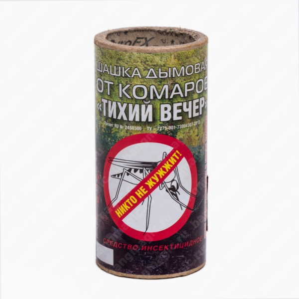 Дымовая шашка Тихий вечер предназначена для уничтожения комаров, а также других насекомых и паразитов (гнус, мошкара, слепни, клопы, тараканы, моль, блохи, муравьи, мухи, крысиные клещи и т.д.).Может применяться как на участке открытой местности, так и в закрытых помещениях.При использовании шашки на открытом воздухе площадь ее действия варьируется от 100 до 300 квадратных метров (в зависимости от силы ветра).При уничтожении комаров и насекомых в закрытом помещении одна такая дымовая шашка заполняет дымом объем до 1000 м3. Шашку поджигают с помощью имеющегося в комплекте фитиля, и она начинает быстро и интенсивно тлеть. При этом выделяется большое количество белого дыма. Этот дым представляет собой очень мелкий аэрозоль перметрина – основного действующего вещества. Он и уничтожает комаров и других летающих паразитов.Затем перметрин оседает на поверхности (горизонтальные и вертикальные) тонким слоем и убивает там всех ползающих насекомых. И это его активное действие будет продолжаться еще примерно 2 недели (или до первого дождя или влажной уборки).Подробная инструкция с описанием правил использования и мер предосторожности расположена на обратной стороне корпуса изделия. |