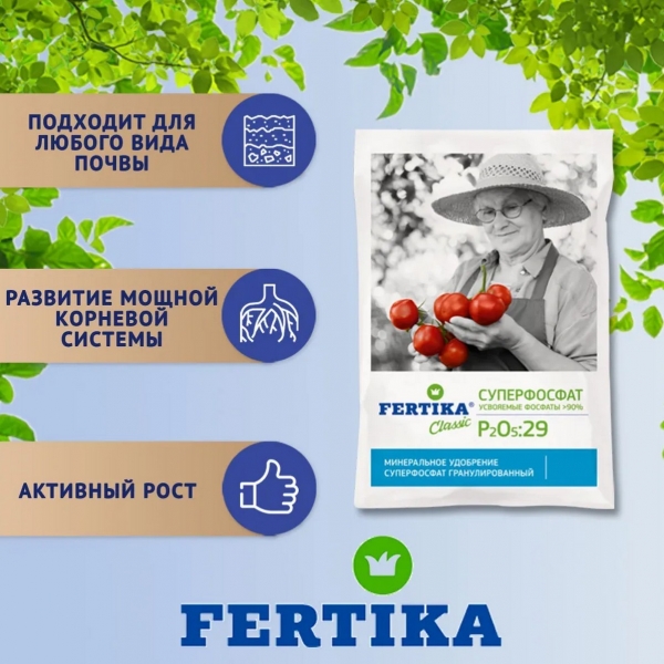 Удобрение Суперфосфат Fertika, 1 кг. СРОК ХРАНЕНИЯ МИНЕРАЛЬНЫХ УДОБРЕНИЙ 5 ЛЕТ. Хранить в полиэтиленовом пакете или пластиковой закрытой таре, чтобы не попадала влага, на полках. На полу в гаражах и подвалах лучше не хранить, т.к. возможно скопление конденсата и затвердевание удобрения. Замораживание, отрицательные температуры не влияют на полезность удобрения. Минеральное удобрение Fertika Суперфосфат, 1 кг. Высокоэффективное гранулированное фосфорное удобрение. Используется на различных типах почв в т.ч. в условиях защищенного грунта Способствует развитию мощной корневой системы. Гарантирует ускорение созревания и повышение урожайности, улучшает качество продукции. Используется для основного внесения при подготовке почвы весной и осенью предпосевного в рядки, борозды или лунки, а также для подкормки в течение вегетационного периода. При подготовке участка к посеву растений простой суперфосфат вносят весной или осенью под перекопку, в среднем расходуя около 40-50 г удобрения на 1 кв.м. Двойной суперфосфат вносят из расчета 20-30 г на 1 кв.м. Срок годности 5 лет. Fertika комплексное удобрение для садовых растений, цветов розы гортензии азалии крокусы и овощей томатов огурцов капусты редиса салата помидор ягод клубники малины земляники. Fertika универсальная подкормка для кустов (смородины крыжовника) и деревьев плодовых яблонь груш вишни, хвойных сосна туя елка, декоративных. Все для садоводства для теплиц или открытого грунта. |