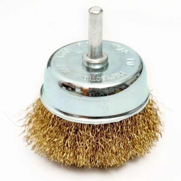 Для изготовления щетки применяется стальная латунированная витая проволока диаметром 0,3 мм. Корпус щетки выполнен в форме чашки методом штамповки из листовой стали. Применяется для щадящей очистки поверхностей и получения заданной шероховатости. |