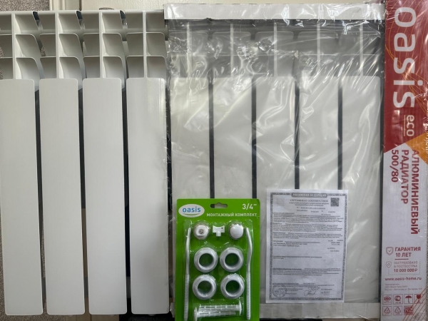 Алюминиевые радиаторы Oasis разработаны специально для российских условий. Алюминиевые радиаторы более всего подходят для автономных систем отопления в частных домах, коттеджах. Это связанно с водоподготовкой в центральных системах отопления плохое качество теплоносителя, а также возможные гидравлические удары в моменты пуска системы после профилактического обслуживания. Высокий коэффициент теплоотдачи; Простые в монтаже; Небольшой вес; Оптимальное соотношение цены и качества; Не нуждаются в перекраске на протяжении на всего срока службы; Современная система контроля качества изготовления изделия на всех этапах; В качестве теплоносителя может использоваться вода и не замерзающие жидкости; Гарантия 15 лет. |