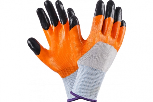Перчатки нейлон с 2-м нитрил. покрытием черные пальцы оранжевый /12/960/38 руб.