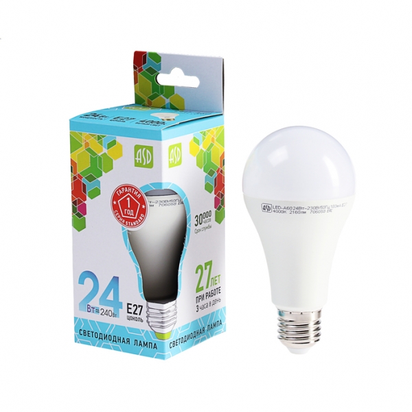 Светодиодная лампа ASD серии LED-A60-standard классической грушевидной формы изготовлена с использованием LED-технологий, позволяющим в десятки раз увеличить срок службы и получить до 90 процентов экономии электроэнергии. Класс энергоэффективности А Является отличной заменой люминесцентных ламп и ламп накаливания. Линейка ламп ASD серии LED-A60-standard в цоколе Е27 представлена в диапазоне мощности от 5Вт до 24Вт и цветовых температурах от 3000К до 6500К. |