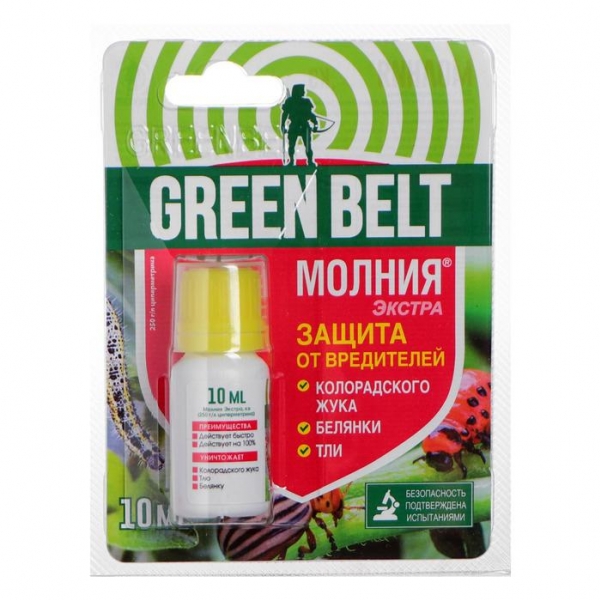 Средство от вредителей Молния Экстра, 10 мл. Молния - это высокоэффективный препарат от колорадского жука на картофеле и комплекса вредителей на розах и других декоративных растениях. Молния обладает выраженным нокдаун-эффектом. Гибель насекомых наступает уже через 30 минут. Высокая активность препарата сохраняется в течение 2 - 3 недель. Специальные добавки обеспечивают устойчивость к смыванию дождем. Подавляет развитие паутинных клещей.Вид вредителя: колорадский жук, капустная муха, белянки; Применение: картофель, капуста, цветочные культуры. |