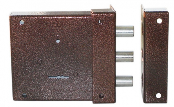Замок накладной сувальдный. Предназначен для установки на металлические двери. Засов из трех цилиндрических ригелей диаметром 16 мм, с максимальным вылетом 30 мм. Удаление ключевого отверстия - 70 мм. Комплектация - 4 ключей, торцевая планка, накладка. |
