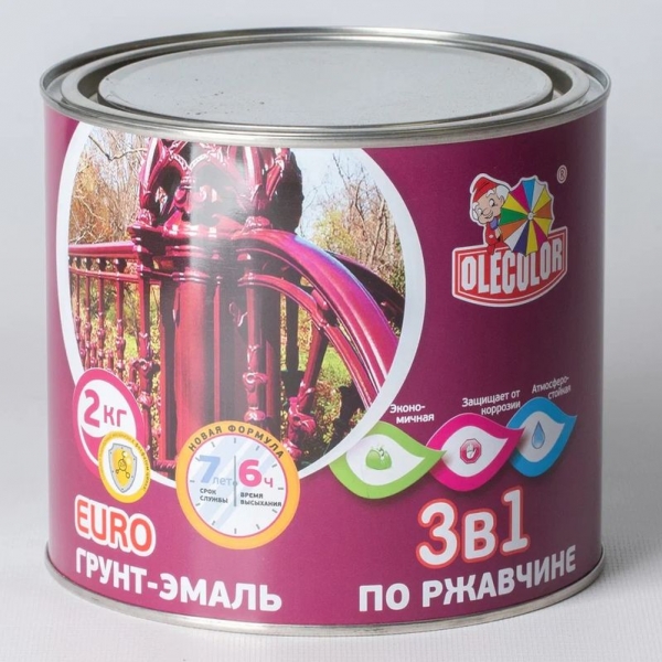 Грунт эмаль 3 в 1 Olecolor , краска по металлу Олеколор для преобразования ржавчины, грунтования и окраски чистых и пораженных ржавчиной металлических поверхностей. Ингибитор коррозии в составе преобразует ржавчину в прочный грунтовочный слой, предотвращает дальнейшее образование подслойной коррозии. Это 3 материала в одном: грунт, преобразователь ржавчины и финишная эмаль. При температуре плюс 20 градусов однослойное покрытие высыхает через 6 ч. Повторное нанесение следующего слоя допускается через 24 часа. Время полного высыхания (набор твердости) - 4-5 суток. Расход 80-150 г.кв, при однослойном покрытии, в зависимости от метода нанесения. Применение грунт-эмали значительно упрощает подготовку поверхности к окрашиванию и удешевляет технологию создания антикоррозионного покрытия. Сырьевые компоненты, входящие в состав грунт-эмали, действуют комплексно, преобразуют ржавчину в прочный защитный слой, образуют на поверхности металла прочное атмосферостойкое декоративное покрытие. |