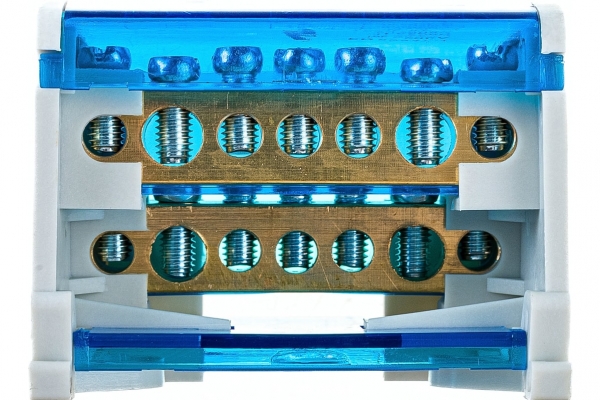 LD505-207 Шины на DIN-рейку в корпусе кросс-модуль 2 шины по 7 контактов L плюс PEN применяется в щитовом оборудовании для подсоединения нулевого провода, провода заземления и фазных проводников. Контактная группа шин изготовлена из латуни с содержанием меди не менее 57 процентов. Изолирующая панель и защитная крышка выполнены из самозатухающего пластика. Прижимные винты из аннодированной стали. При подключении к шине медных многожильных проводов необходимо оконцовывать их наконечниками-гильзами. Кросс модули изготавливаются с двумя или четырьмя шинами, которые имеют отверстия различного диаметра и рассчитаны на токи до 100 и 125А. Шины закреплены в корпусе, который имеет возможность крепления на DIN-рейку 35мм или на монтажную панель щита с помощью двух винтов |