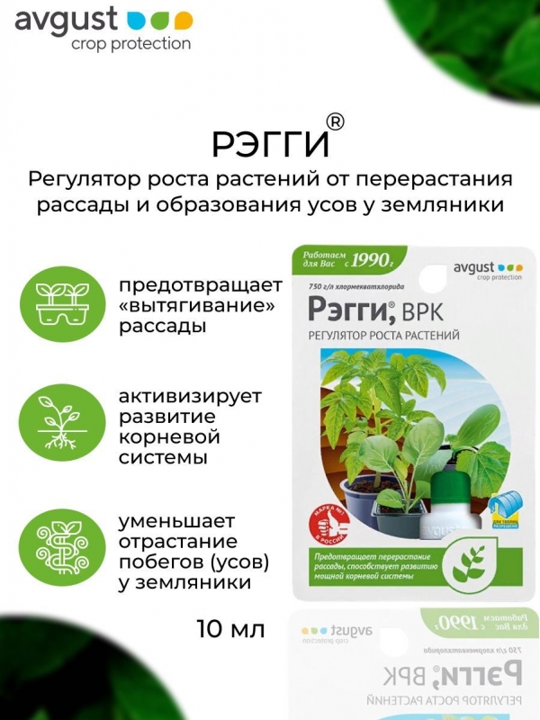 Регулятор роста растений Рэгги ВРК, ампула 1 мл Препарат специально предназначен для предотвращения перерастания рассады. Его раствором нужно проводить трехкратное опрыскивание томатов и перцев начиная с фазы 2-4 листьев. Удобрение для растений замедляет избыточный рост стеблей, активизирует корнеобразование и способствует формированию мощного приземистого куста. Удобрение универсальное улучшает декоративные свойства растений, способствует формированию крепкой рассады. Может применяться для рассады всех видов овощных и ягодных культур: томата земляники капусты перца баклажан малины, а также цветочных растений, всех видов комнатных растений и др. Кроме недостатка освещения есть другие причины вытягивания рассады. Например, загущенность посадок. Если между растениями мало места, они начинают конкурировать друг с другом за свет. Также к избыточному росту в высоту приводит несоблюдение температурного режима. До момента прорастания рассаду нужно держать в тепле, а с появлением всходов температуру следует понижать до 15-20 градусов. Не стоит и слишком переувлажнять почву. Полив требуется умеренный и только тогда, когда земля уже высохла. Воздержитесь от избыточных подкормок — во всем нужна мера.Действующее вещество: 750 г/л хлормекватхлорида. Срок годности: 4 года. |