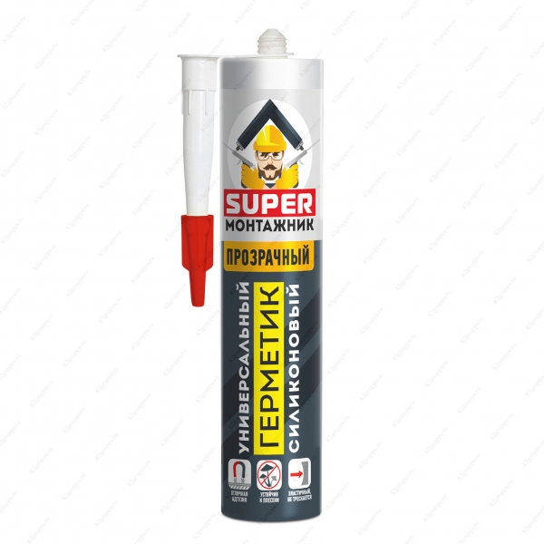 Герметик SUPER МОНТАЖНИК силикон универсал 240 мл. Однокомпонентный силиконовый герметик кислотного типа предназначен для герметизации строительных и конструкционных швов, дверных и оконных рам. При отвердевании доходит до состояния прочного каучука. Предназначен для уплотнения, соединения и защиты непористых поверхностей от проникновения воздуха и влаги; для герметизации оконных рам, дверных коробок, кабельных каналов; герметизации стыков при монтаже сантехнического оборудования, систем кондиционирования воздуха; защиты полиуретановой монтажной пены от УФ-лучей. Характеризуется отличной адгезией к нержавеющей стали, анодированному алюминию, стеклу, керамической плитке, пропитанной или лакированной древесине, эпоксидной смоле, ламинату, большинству красок, многим пластикам, таким, как полиэстер, полиакрилат. Быстро покрывается плёнкой. Устойчив к воздействию большинства моющих и чистящих средств, стоек к УФ-излучению, атмосферным воздействиям, температурным перепадам и практически любым агрессивным средам. Тиксотропный, не растекается и не сползает по шву. Сохраняет эластичность после отверждения. Область применения: Герметизация оконных рам, дверных коробок, кабельных каналов; Герметизация стыков при монтаже сантехнического оборудования, систем кондиционирования воздуха; Защита полиуретановой монтажной пены от УФ-лучей. Преимущество: проявляет прекрасную адгезию к большинству строительных материалов; не меняет цвет и прочность под воздействием солнечного света; водонепроницаем; устойчив к изменению размеров шва за счёт запаса эластичной упругости; широкий температурный диапазон использования в отвердевшем состоянии; проявляет устойчивость к образованию грибков и плесени; однородный, густой, тиксотропный, не растекается и не сползает на поверхности и в швах |