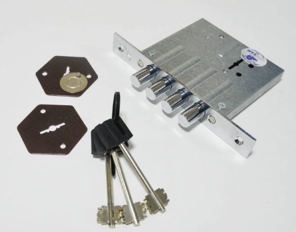 Замок врезной 8-ми сувальдный ЗВ8-8М/13 предназначен для установки в металлические и деревянные двери толщиной 30-90мм и металлические шкафы. Замок универсальный, возможна установка как в правые, так и в левые двери. В комплекте: 2 декоративные накладки медный антик, 3 стальных ключа длиной 70мм. Замок открывается и закрывается изнутри и снаружи ключом. Засов из четырёх стержней круглого сечения. Покрытие корпуса - цинковое. Покрытие лицевой планки - никелевое. Замок имеет защиту от высверливания, защиту от отмычек. Изготовлен из высокопрочных материалов. Имеет защитное покрытие. Количество секретных комбинаций - 250 000. Вылет ригелей - 22мм. Диаметр ригеля - 13,7мм. Бэксет - 66,5мм. |